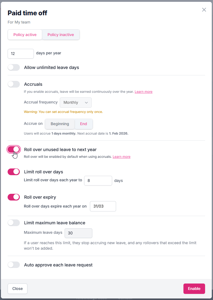 Then turn on the Roll over unused leave to next year toggle. You'll be able to set the specific rollover policy you need -